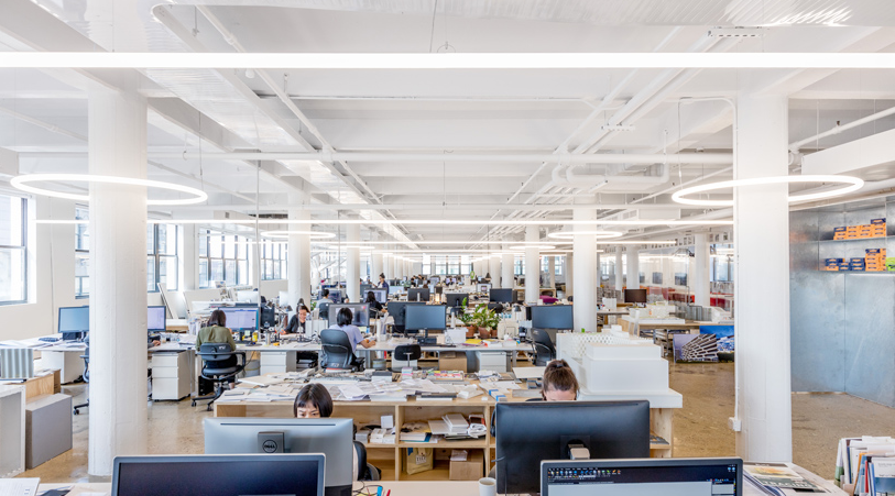 由于振興后的工業區位于紐約東河沿岸,開放式辦公室裝修的連續玻璃窗提供了毗鄰曼哈頓天際線的全景。這間辦公室是由BIG的內部團隊設計和規劃的,其特點是重復的元素,為整個開闊的空間提供了連貫的連續性。