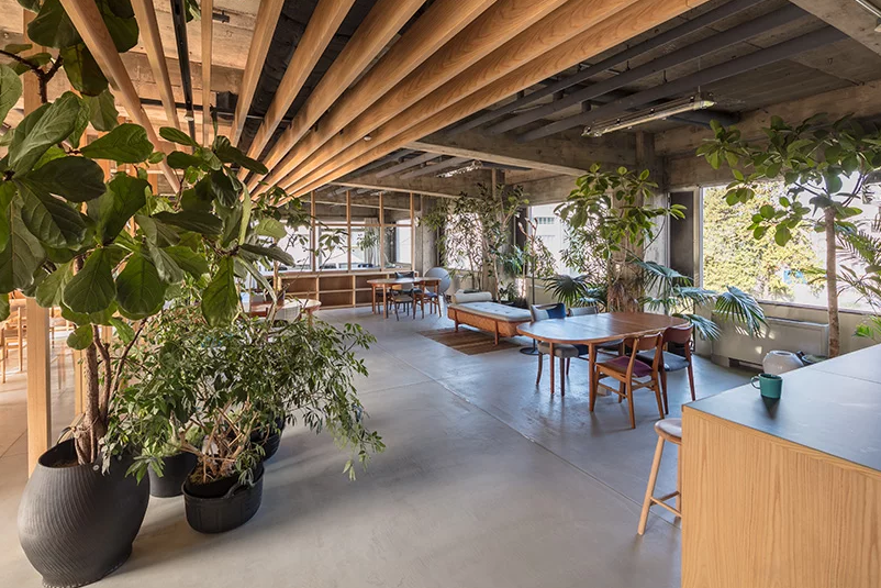 整個辦公室裝修,室內沒有墻壁或固定隔墻,充滿了柔和的自然光。辦公室里的所有物品——包括豐富的綠色植物、古董沙發和一張大橡木桌——都是為了加強創造性的交流。建筑師說:“我們的設計構思了一個前所未有的沒有新奇感的空間。”