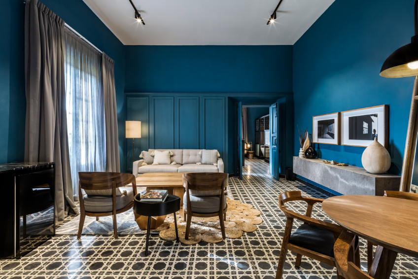 該酒店裝修小組還修復了建筑物的屋頂平臺和殖民風格的庭院,周圍是灰色的石柱,家里有一個200年歷史的橡樹樹和一個巴黎噴泉在1850的時候栽植的。